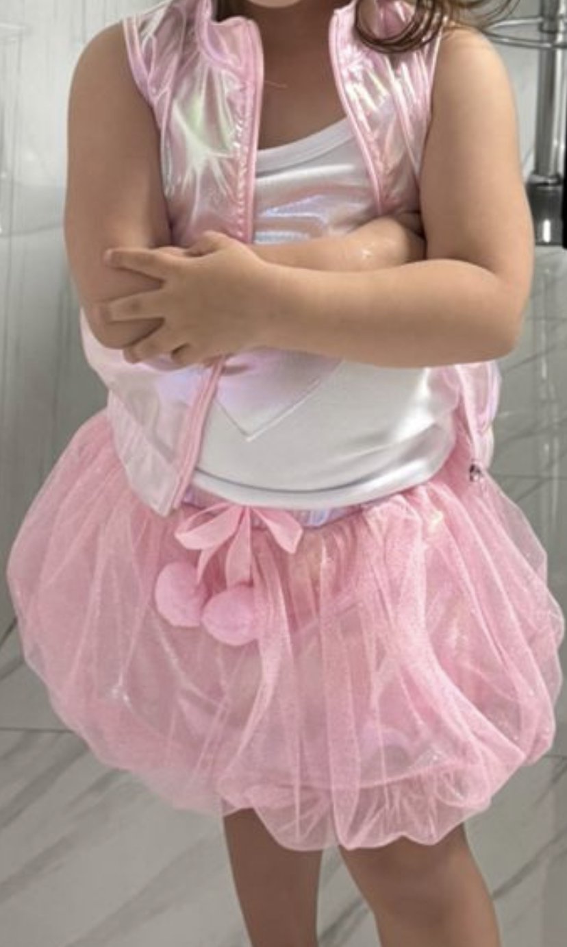 Descrição:Conjunto composto por três peças maravilhosas e super versatil colete, regatinha e saia. Colete no tecido holografico rosa peroladp, com zíper destacavel na frente podendo usar abertinho o fechado, elastico em baixo. Regatinha alcinhas fininha confeccionada no crepe de malha, com aplique de coração na frente no mesmon tecido do colete. Saia modelo balonê super fofa, tecido metalizado perolado e por cima tule com gliter em baixo com shortinho, detalhes de pompom, elastico na cintura vestindo super bem. Modelo super fofo e estiloso dando para usar desmenbrados e compor varios looks lindos!